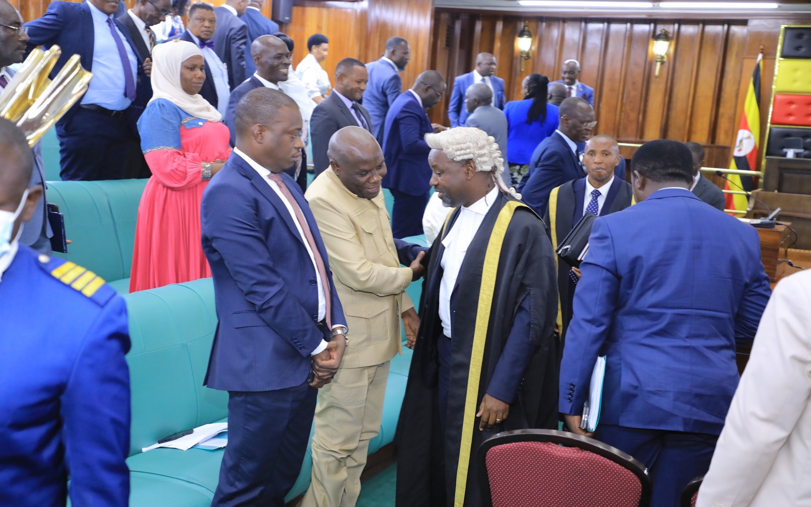 The Attorney General, Kiryowa Kiwanuka (2nd L) and State Minister for Finance, Musasizi interact with the LoP, Joel Ssenyonyi (R) as Hon. Achia looks on